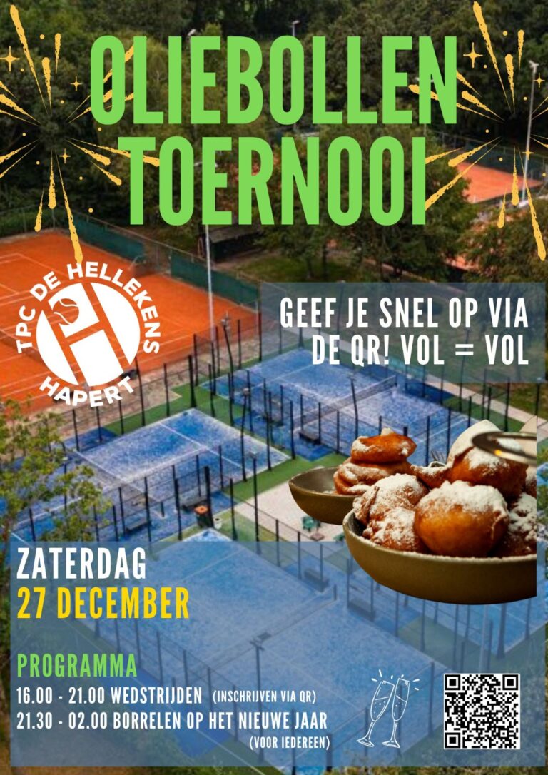 Op zaterdag 27 december organiseren weer we het gezellige oliebollentoernooi, ook voor de jeugd. Je kunt starten om 16.00 of om 18.00. Geef je op via de QR code of deze link: Oliebollen toernooi 2025