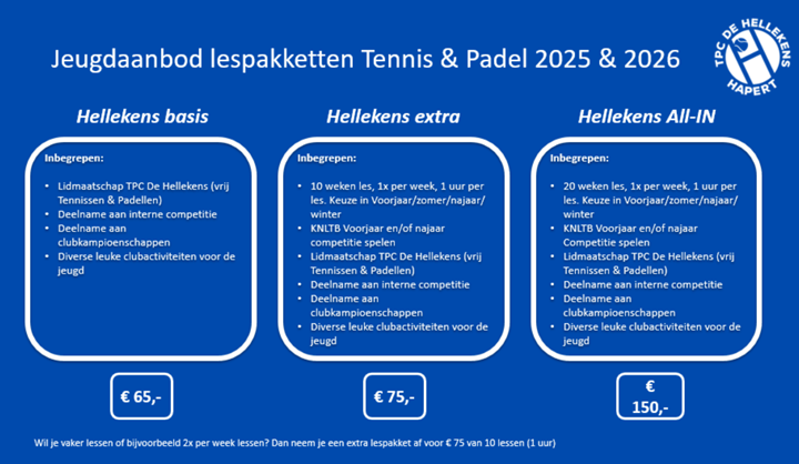 Aanvullend op de hierboven genoemde lespakketten, biedt TPC De Hellekens haar jeugdleden: